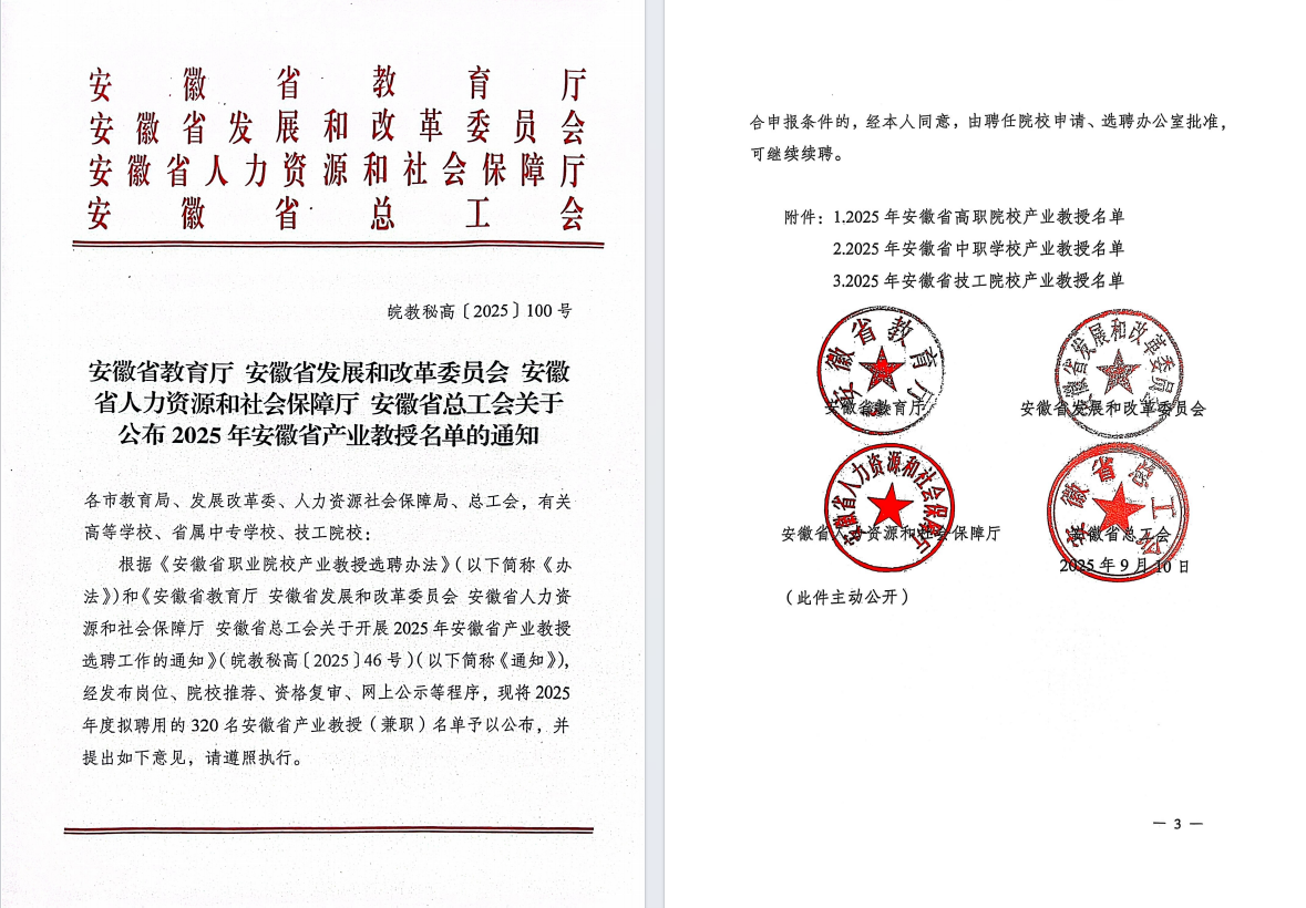 根據《安徽省教育廳 安徽省發(fā)展和改革委員會 安徽省人力資源和社會保障廳 安徽省總工會關于公布2025年安徽省產業(yè)教授名單的通知》(皖教秘高〔2025...